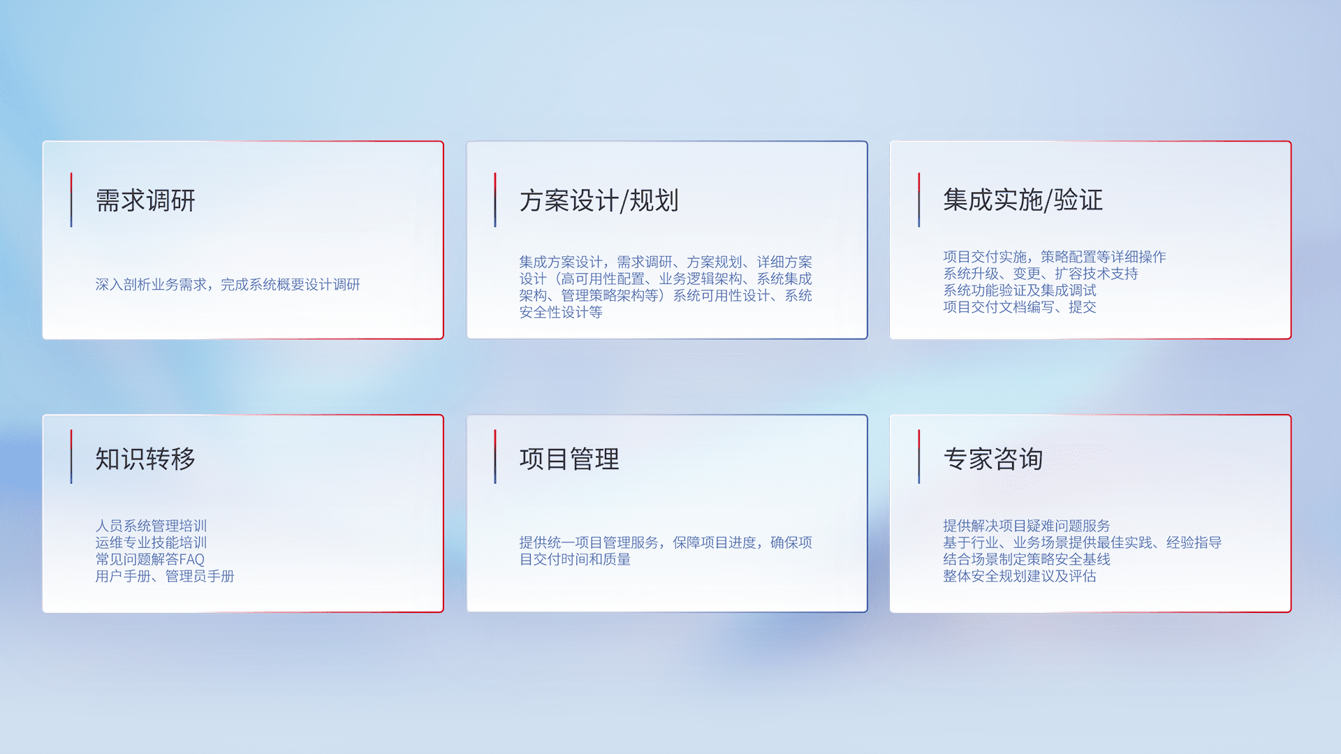 针对客户行业特性,,,将宏观的安全战略和需求,,通过专业的交付服务,,实现项目落地,,,,为客户提供标准规范的集成交付服务。。